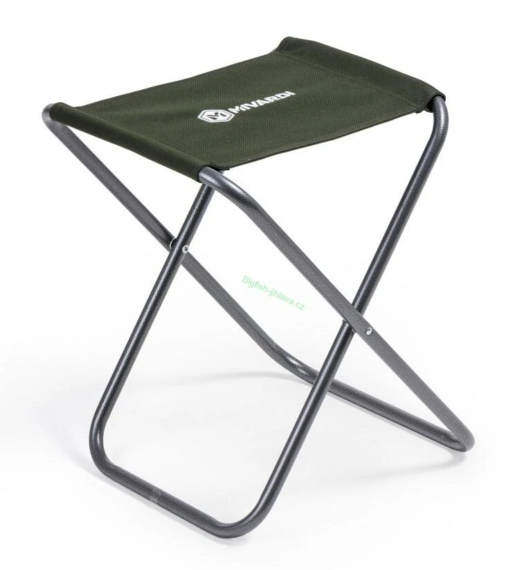 Klasická rybářská stolička s jednoduchou konstrukcí a pevným potahem.
